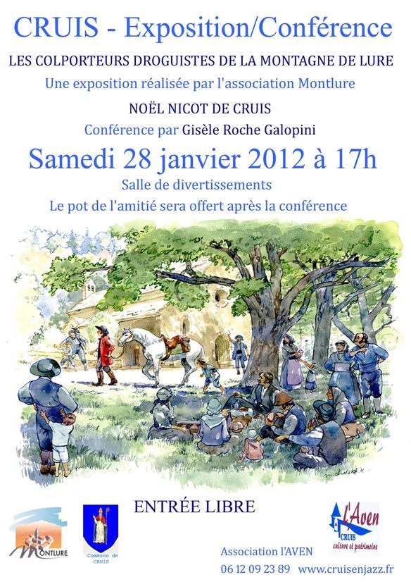 L’association l’AVEN recevra le 28 janvier 2012 à 17h00 (salle de divertissements), Madame Gisèle Roche-Galopini, qui présentera une exposition de l’association MONTLURE (de Saint-Etienne-les-Orgues) et animera une conférence sur Noël NICOT, colporteur droguiste, originaire de Cruis.